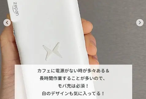 カフェに電源がない時が多々ある&長時間作業することが多いので、モバ充は必須! 白のデザインも気に入ってる! モバイルバッテリー zepan wpd30 充電状況や残量表示がされるから、使用したい時に、バッテリーなかった!なんてことがなくなる! TypeCにも対応 コンセントに刺して直接充電できる 変換コネクタがついていているので、特別なケーブルを用意しなくてもiphoneを充電できちゃう! 重さも266gと軽量だから外での勉強でも持ち運びが楽チン!
