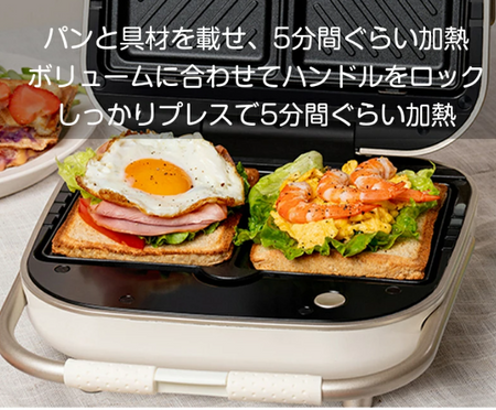 同時に二枚:二枚焼きホットサンドメーカーには通常、独立した二つのプレートが備わっています。これにより、同時に二つのサンドイッチを作ることができます。家族やパーティーなどで素早く複数のサンドイッチを準備する際に便利で、時間と手間を節約することができます。