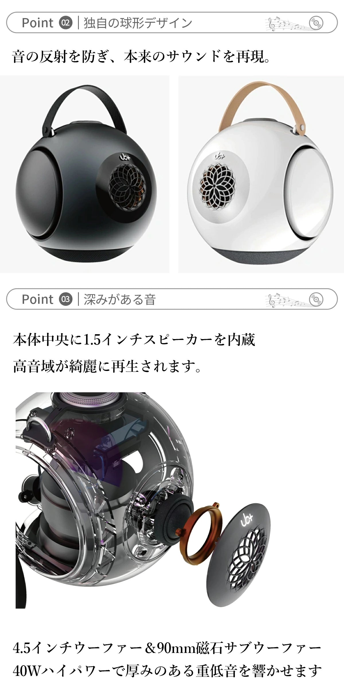 【深みがる音】本体中央に1.5インチスピーカーを内蔵。高音域が綺麗に再生されます。本体の底に大口径4.5インチウーファー&90mm磁石サブウーファーを内蔵。40Wハイパワーで厚みのある重低音を響かせます。